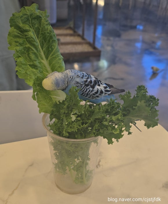 앵무새가 상추도 좋아하더라고요. 열심히 뜯 뜯 해서 먹어요.