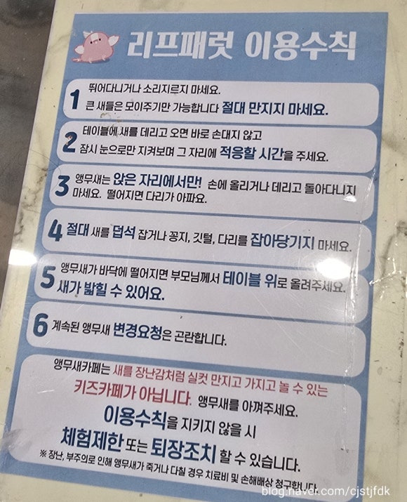 자리에 앉으면 귀여운 앵무새 친구들을 만나게 되는데요. 앵무새를 사랑하는 마음만큼 리프패럿 이용 수칙을 지키는 것도 중요합니다.