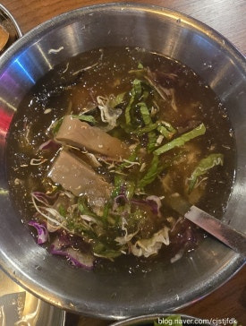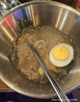 고기를 먹으며 함께 나온온 된장찌개와 공기밥은 구수한 국물 맛이 일품이었고, 마지막 대미를 장식한 물냉면은 살얼음이 가득해 입안을 깔끔하게 정돈해 주었습니다. 쫄깃한 면발과 시원한 육수 덕분에 완벽한 마무리를 할 수 있었어요. 시원한 묵사발도 너무나 맛있는 별미였어요. 남편이랑 고기 구워지기 전에 다 먹어버릴 정도 였어요.