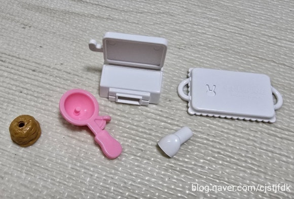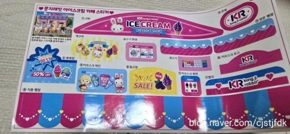핑크색과 하늘색이 어우러진 상자 디자인부터 너무 사랑스러워요. 내부에는 콩지래빗 피규어 1개, 아이스크림 가판대, 컵과 콘, 스쿱(아이스크림 뜨개), 토핑 장식들, 메뉴판 등이 들어있었어요.