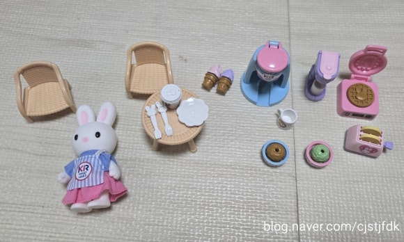 콩지래빗 인형도 기존보다 살짝 다른 복장으로 등장했어요. 파스텔톤의 카페 유니폼과 앞치마가 너무 사랑스럽고, 작은 모자까지 쓰고 있어서 “진짜 직원 같다!”며 아이가 깔깔 웃더라고요.
