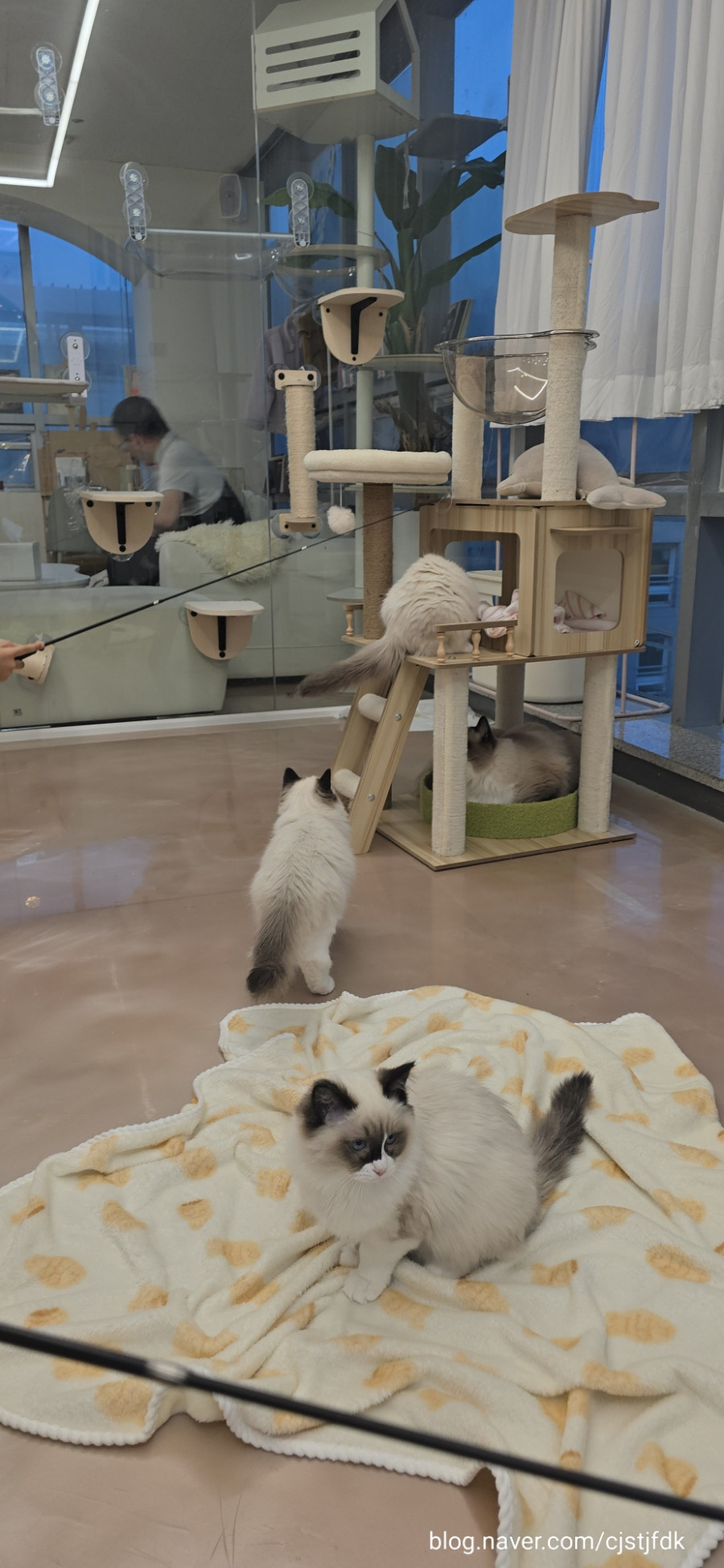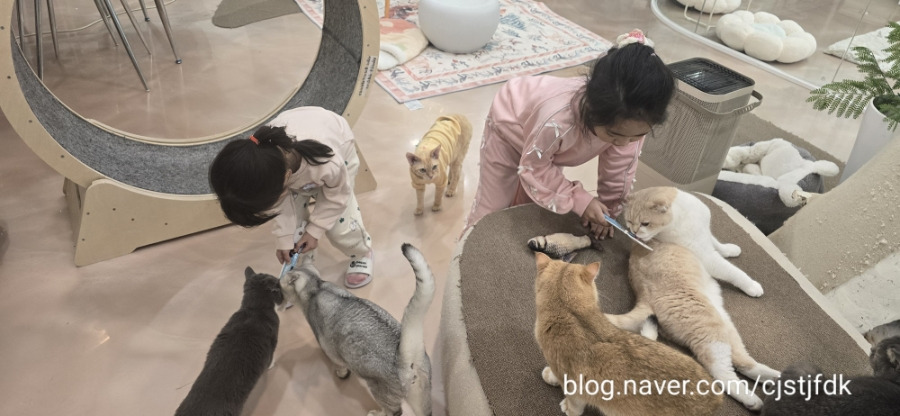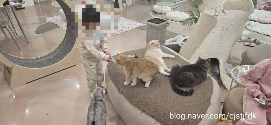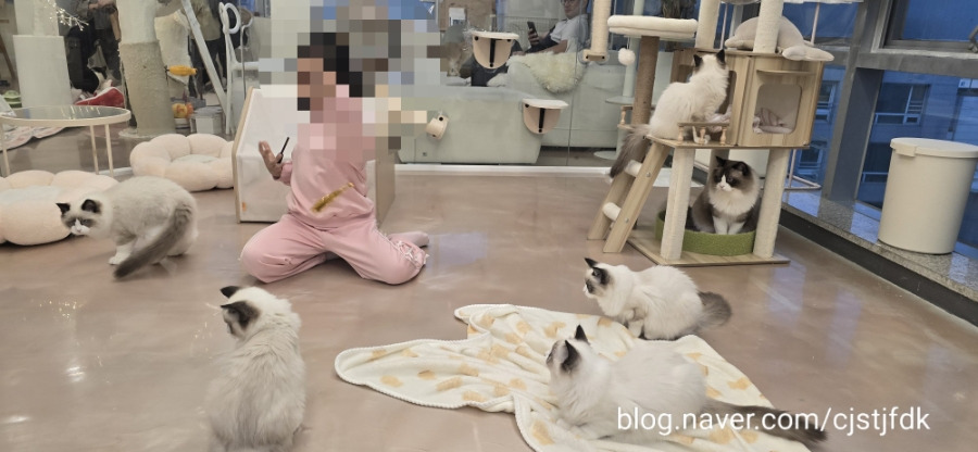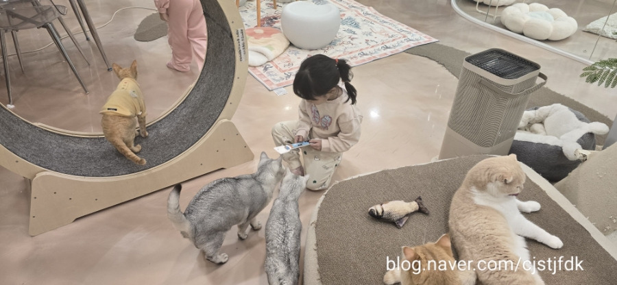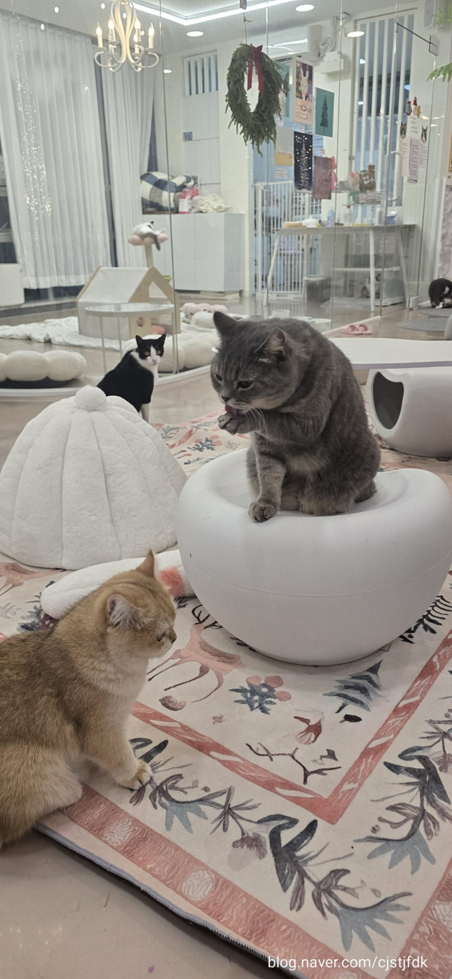 장난감을 흔들면 바로 달려오는 활동적인 아이들도 있고, 높은 곳에서 조용히 관찰하는 도도한 아이들도 있었어요. 무엇보다 털 상태와 전체적인 컨디션이 정말 좋았는데, 관리가 잘 되어 있다는 게 바로 느껴졌어요.