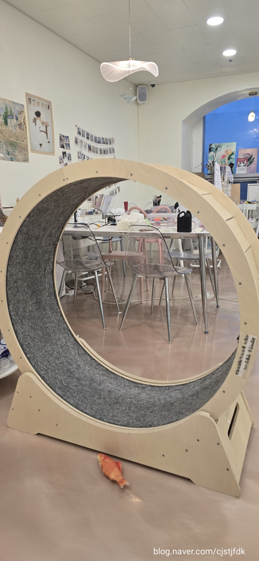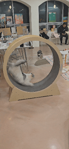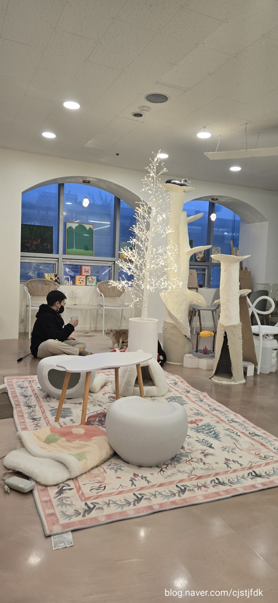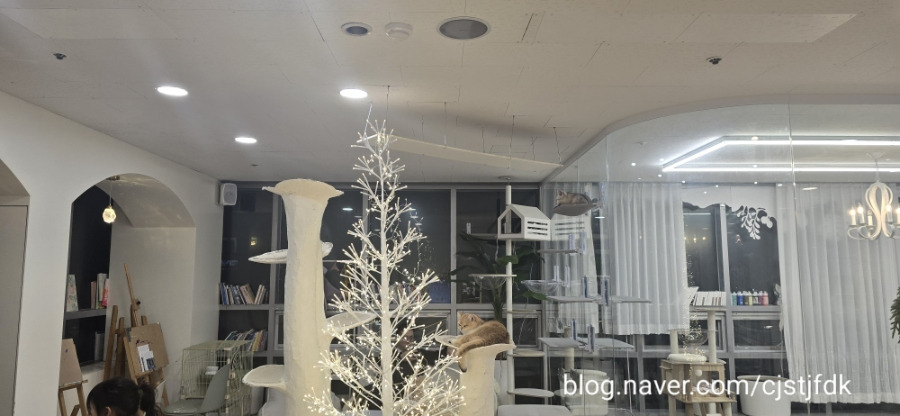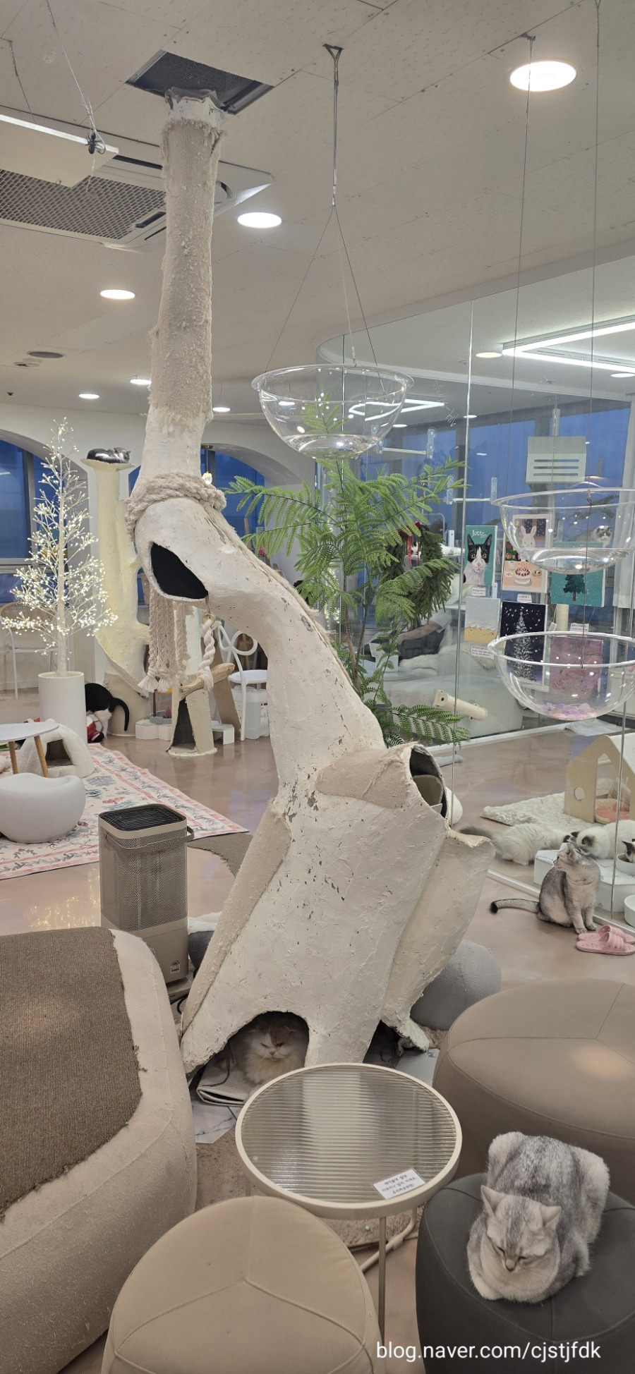 가장 눈길을 끌었던 건 바로 사장님이 직접 제작한 캣타워들이었어요. 일반적인 기성품과는 달리 디자인이 감성적이고 구조가 고양이들의 동선을 세심하게 고려해 만든 것처럼 보였어요. 단순히 ‘고양이가 올라가는 구조물’이 아니라 하나의 작품처럼 보이는 느낌이랄까, 예술과 고양이가 자연스럽게 어우러진 분위기가 정말 매력적이었어요.