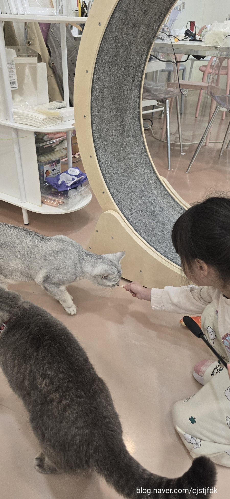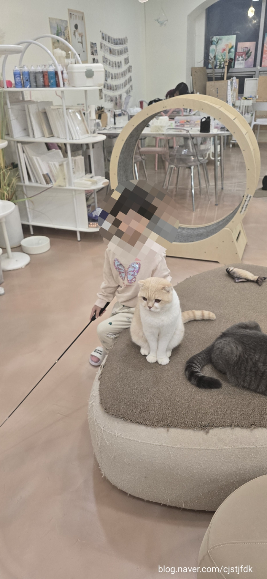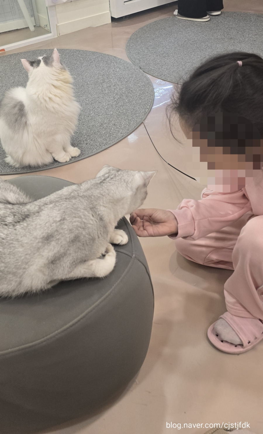 이곳은 고양이들의 자율성을 존중하는 분위기라, 자연스럽고 편안한 교감을 할 수 있었어요. 억지로 만지기보다 고양이가 먼저 다가오는 방식이라 아이들이 스트레스를 받지 않는 모습이 보기 좋았어요.