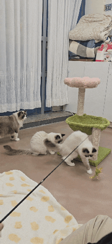 아직 사람 손이 낯설 법한 나이인데도, 이 랙돌 남매들은 사람에게 금방 다가오고, 손가락을 향해 까딱거리며 장난 치고, 무릎에 잠시 올라왔다가 내려가고 정말 천사 같은 존재들이었어요.